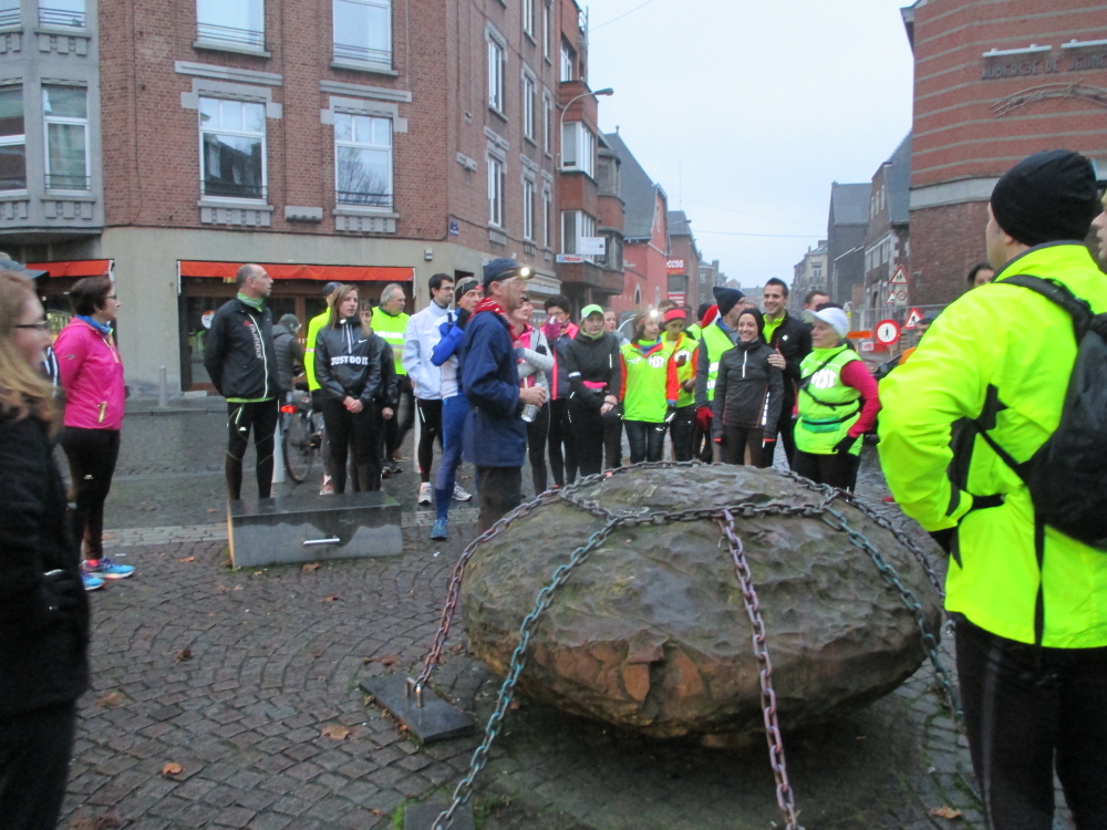 J'arrive sur place avec un petit quart d'heure d'avance et quelques personnes sont déjà là dont René, notre guide. Nous attendons 5' de plus les derniers retardataires et voilà le petit groupe d'une quarantaine de personne parti par monts (les coteaux...) et par vaux (le long de la Meuse...) à la découverte de la cité ardente. Le temps est brumeux et parfois une petite bruine nous accompagne mais pas assez pour décourager les participants.